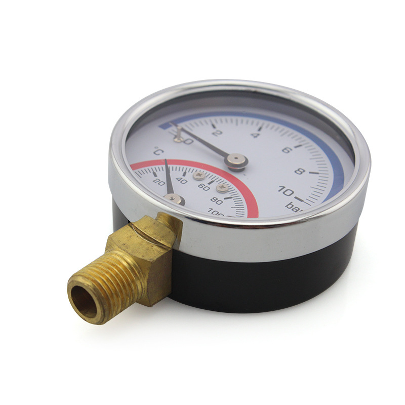 Y63 Radial Combined Pressure Temperature Gauge (0-10 Bar, 0-120°C) with Brass Connection, Stainless Steel Housing