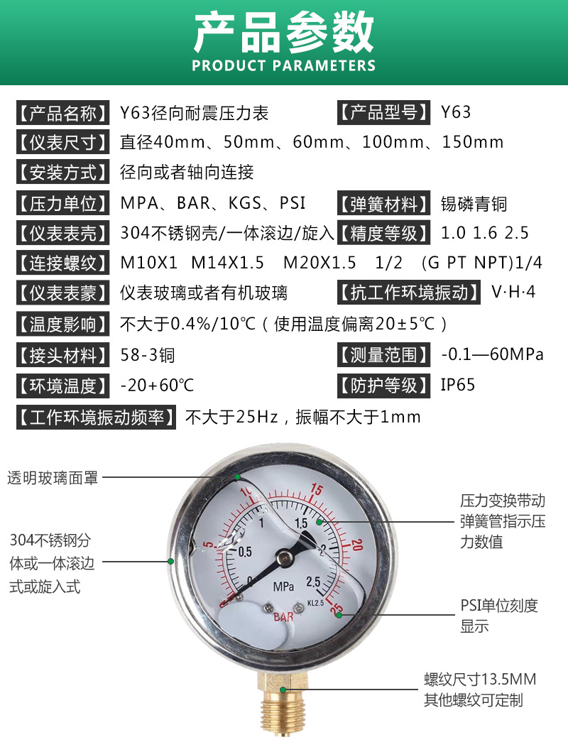 Y63 Radial Thermal Pressure Gauge (Stainless Steel Case, Oil-Fillable, Shockproof) for HVAC Systems, Replaces Standard Pressure Gauges