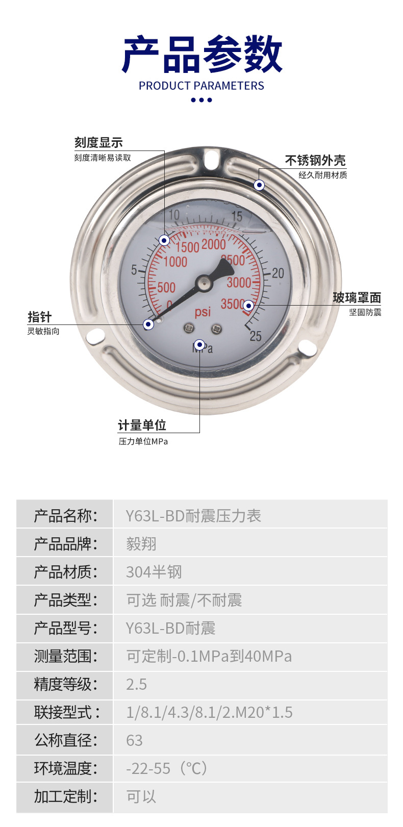 - What You Get: One Y63L-BD anti-vibration pressure gauge, perfect for professional use in industrial, hydraulic, and HVAC pressure measurement tasks. Customizable options available.