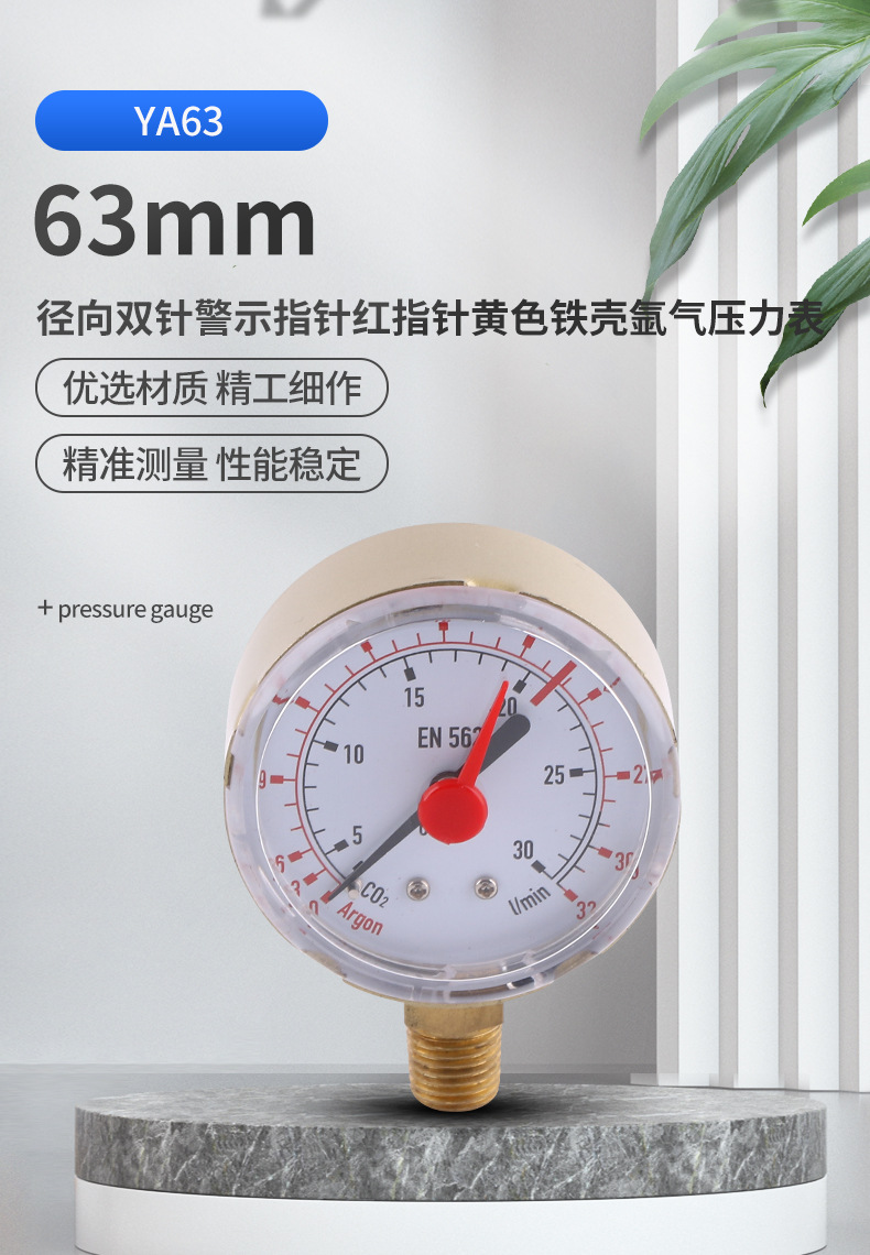 YA63 63mm Radial Dual Pointer Warning Gauge (0-30 L/min, Argon/CO2) for Welding Systems