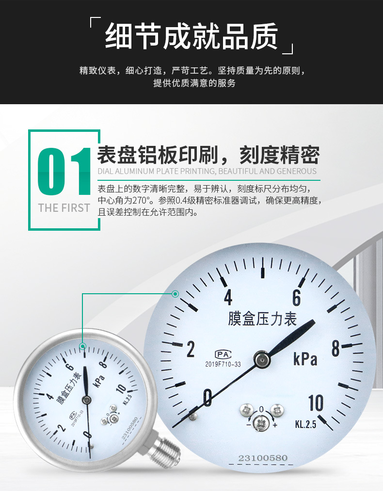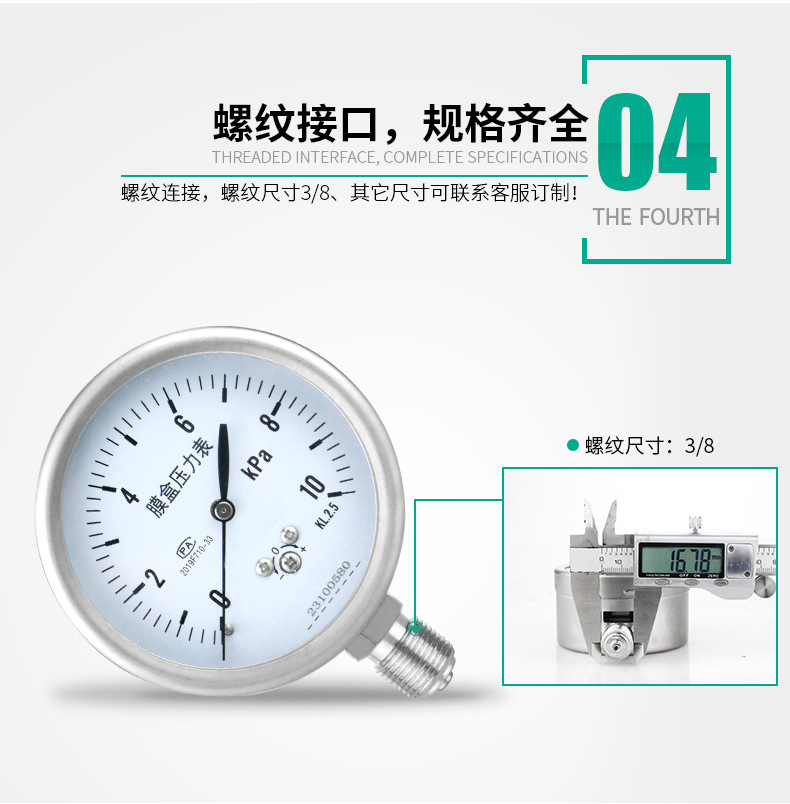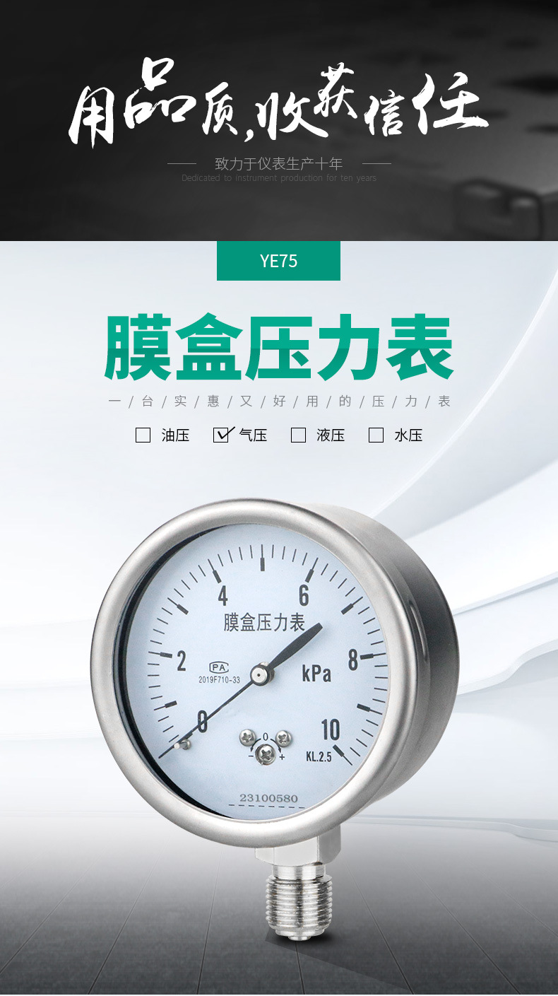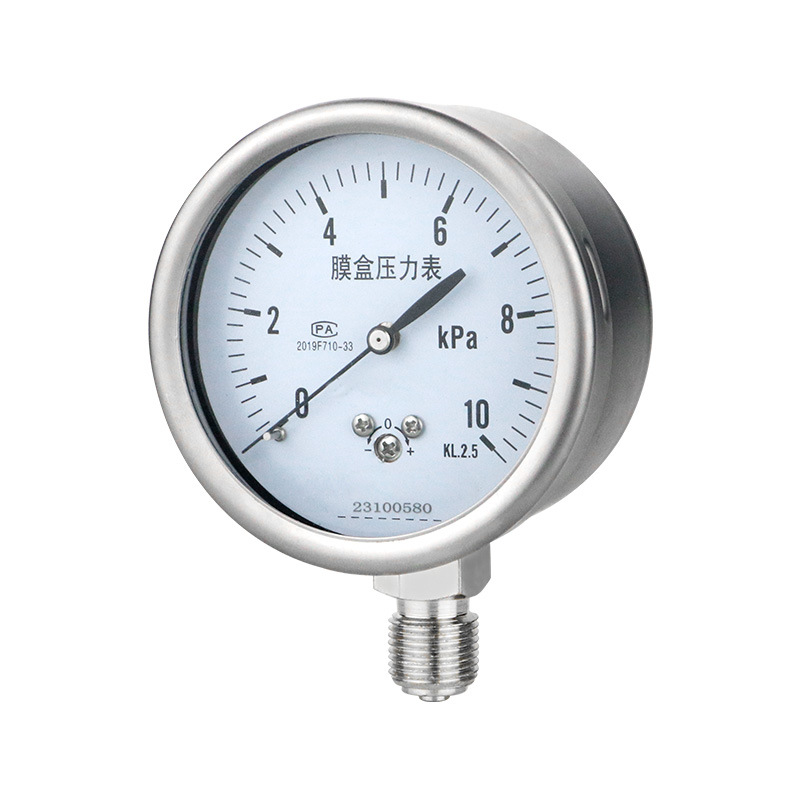 YE75 Diaphragm Pressure Gauge 0-10kPa KL2.5 for Air Pressure Test Over-Pressure Protection