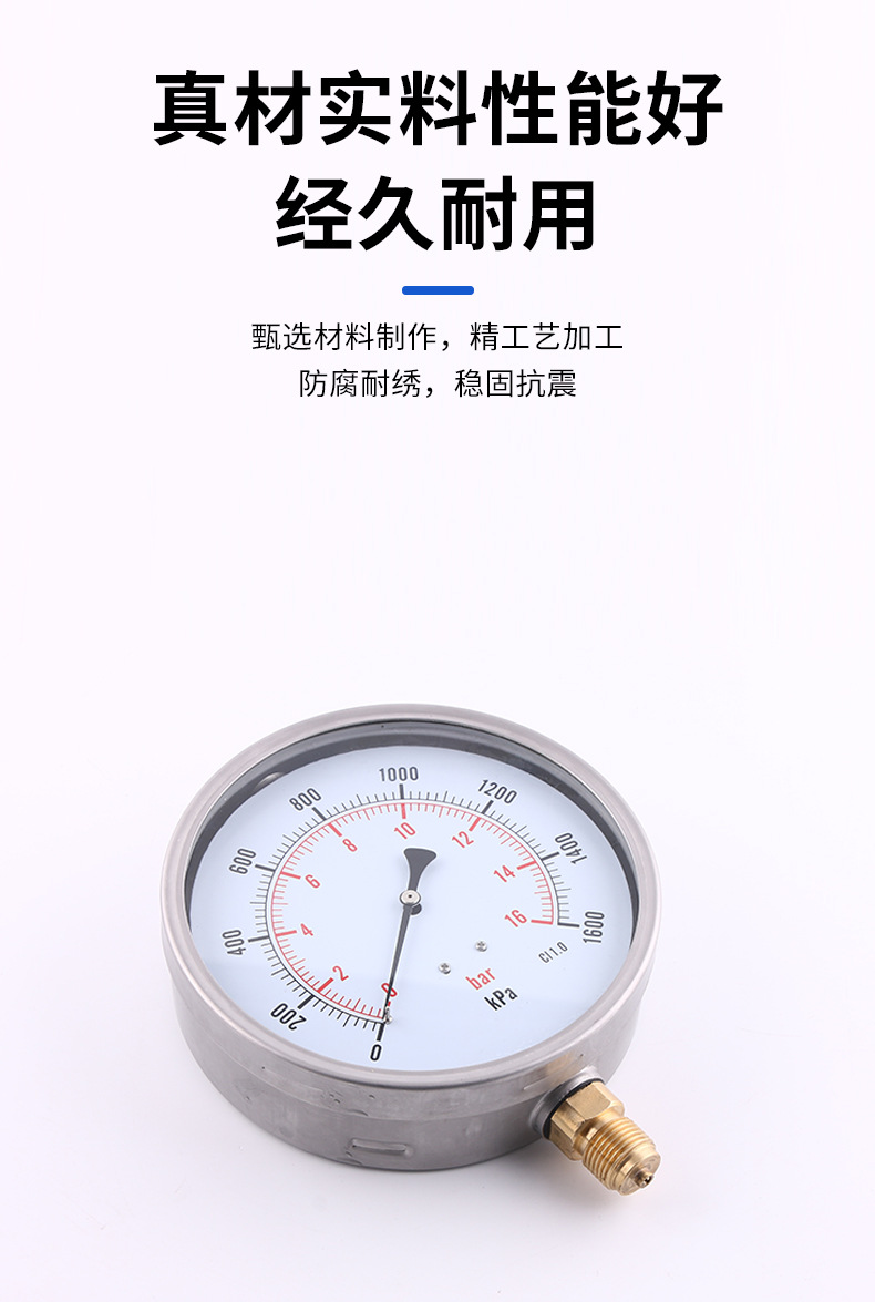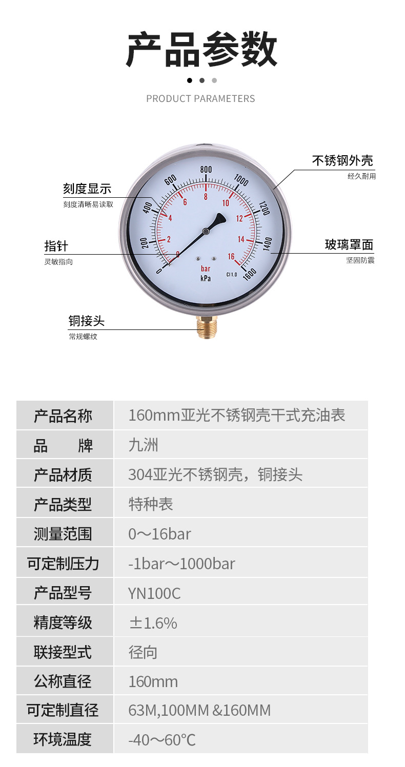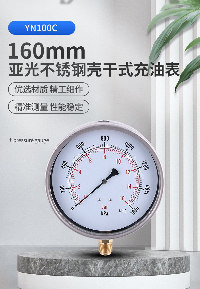 YN100C Radial Pressure Gauge 160mm Matte Stainless Steel Case Copper Joint Dry Oil Filled Meter 0-16bar CI 1.0 accuracy