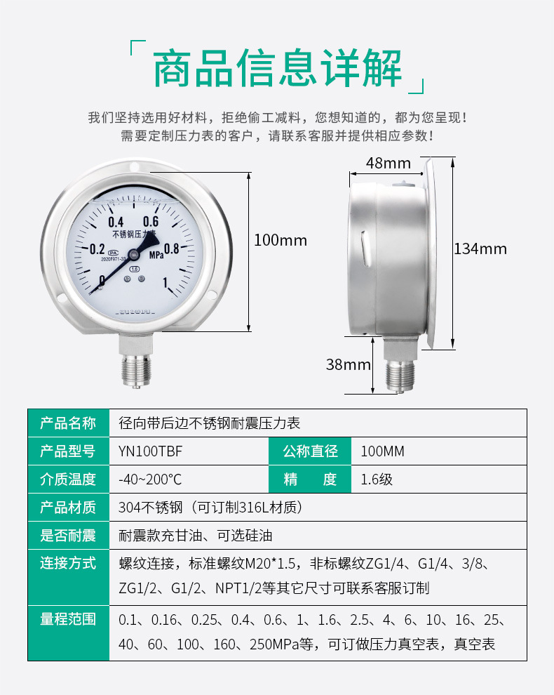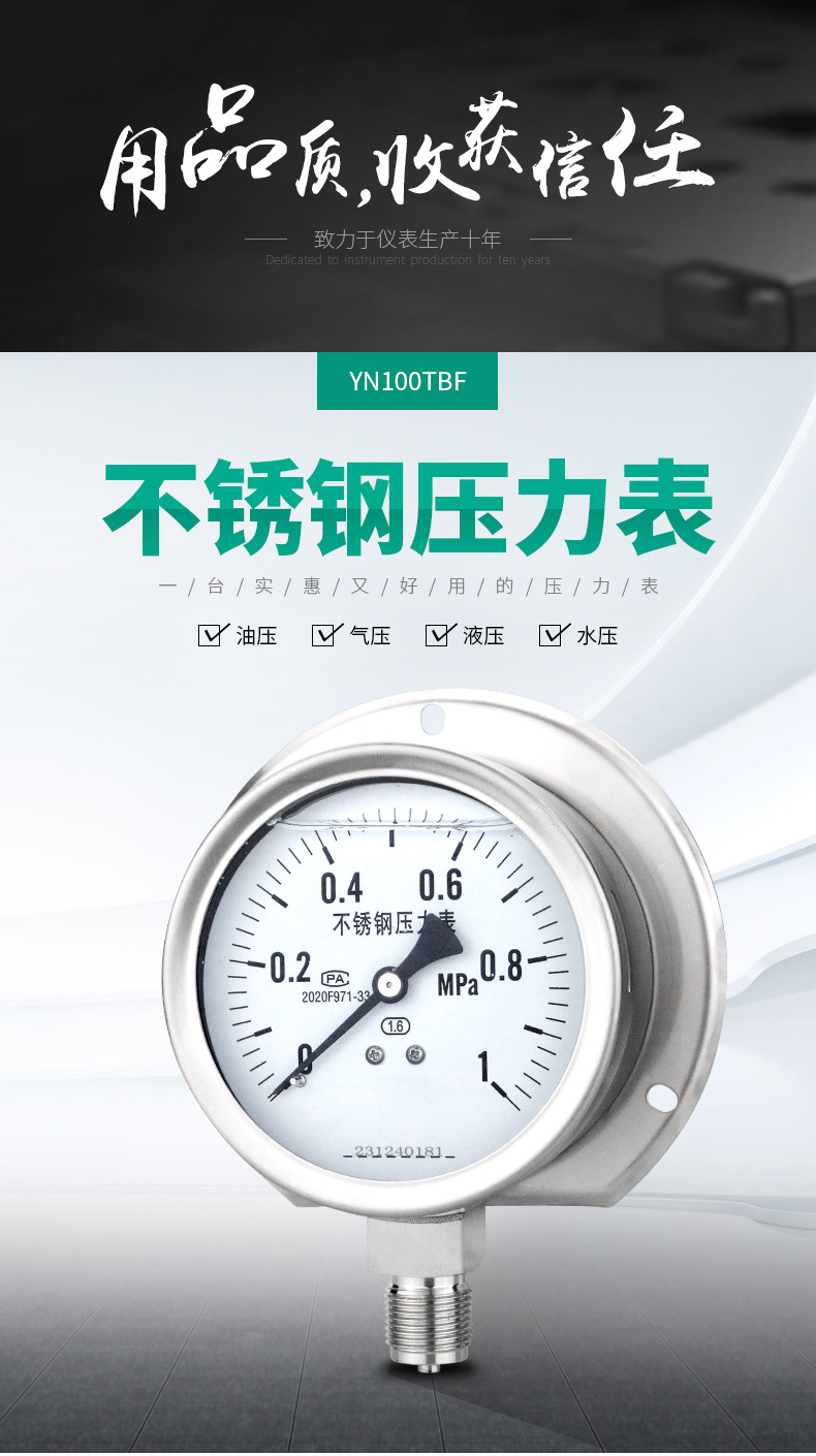 - What You Get: One YN100TBF Stainless Steel Pressure Gauge, factory-tested for quality assurance, offering robust performance and peace of mind for your pressure measurement needs.