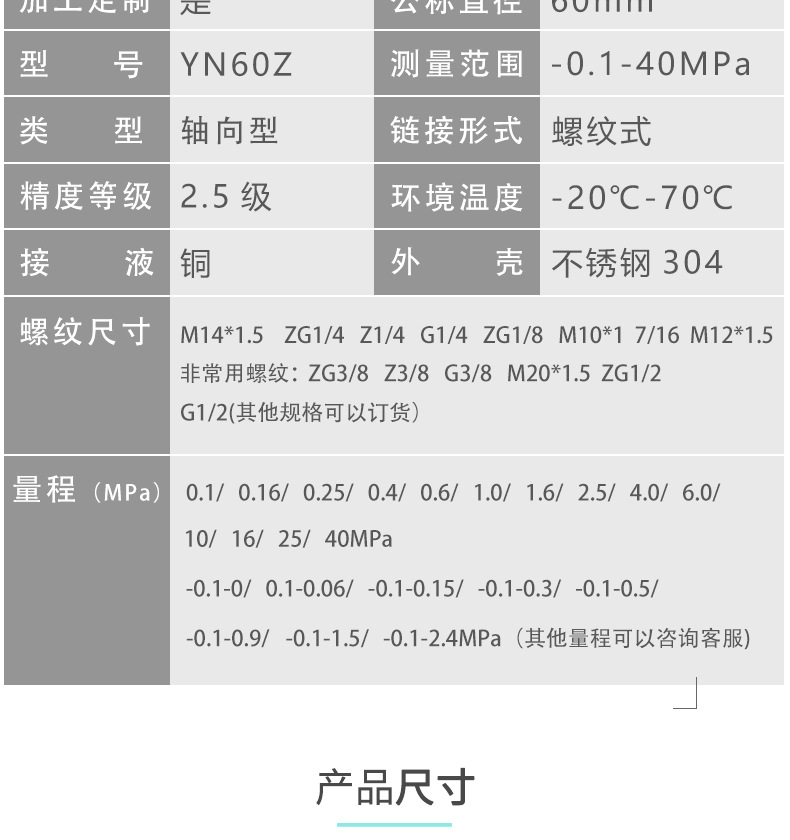 YN60BF/Z Stainless Steel Axial Pressure Gauge (0-2.5 MPa) for Air, Liquid, Oil, Water Pressure Systems