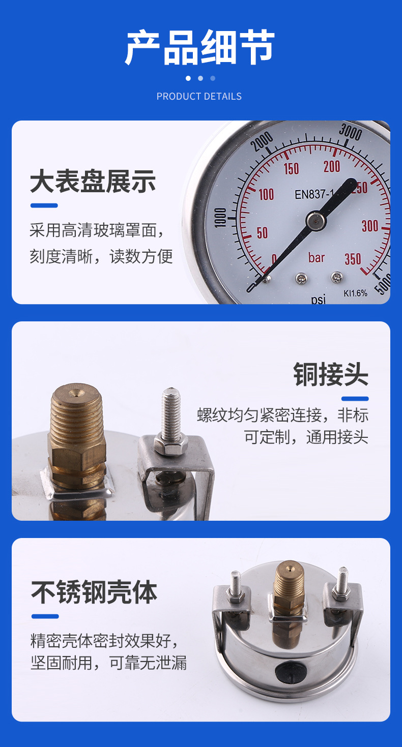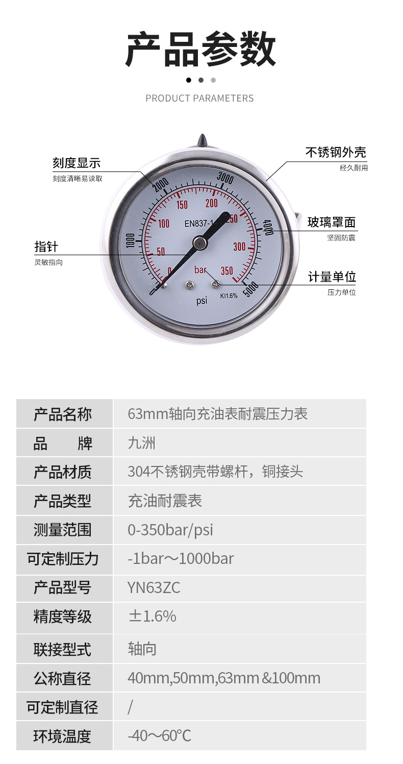 - Key Specs & Performance: Features a 63mm dial size, axial connection, and oil-filled design for superior shock resistance and accurate readings with an EN837-1 K1.6% accuracy class (-40~60°C ambient temperature range).