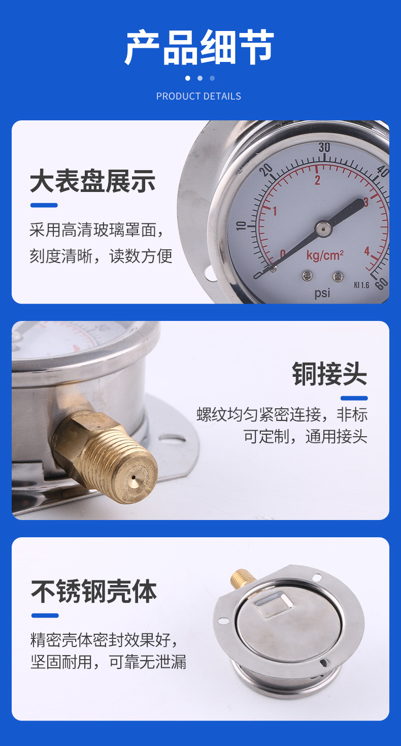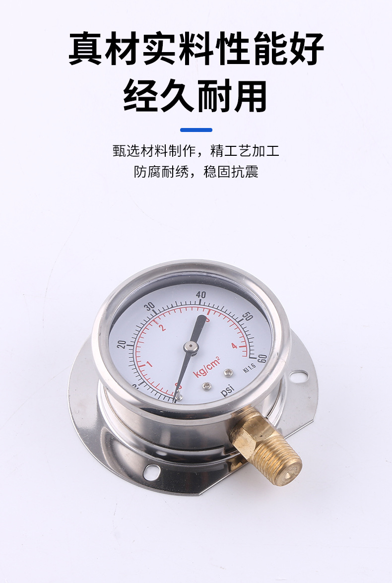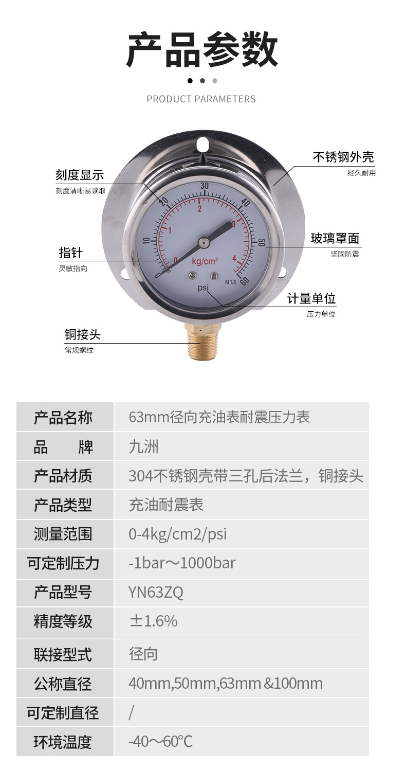 YN63ZQ 63mm Radial Oil-Filled Pressure Gauge (0-4kg/cm2 / 0-60psi) with Stainless Steel Case, Copper Connector, 4-Inch Rear Flange Mount HVAC