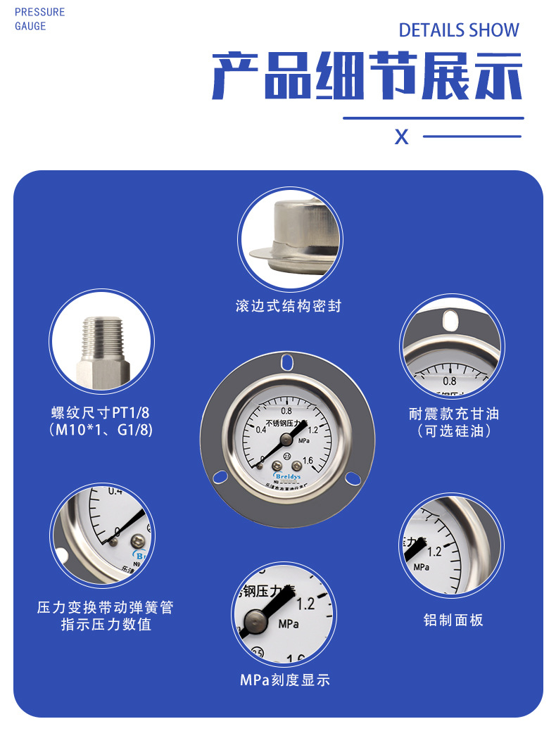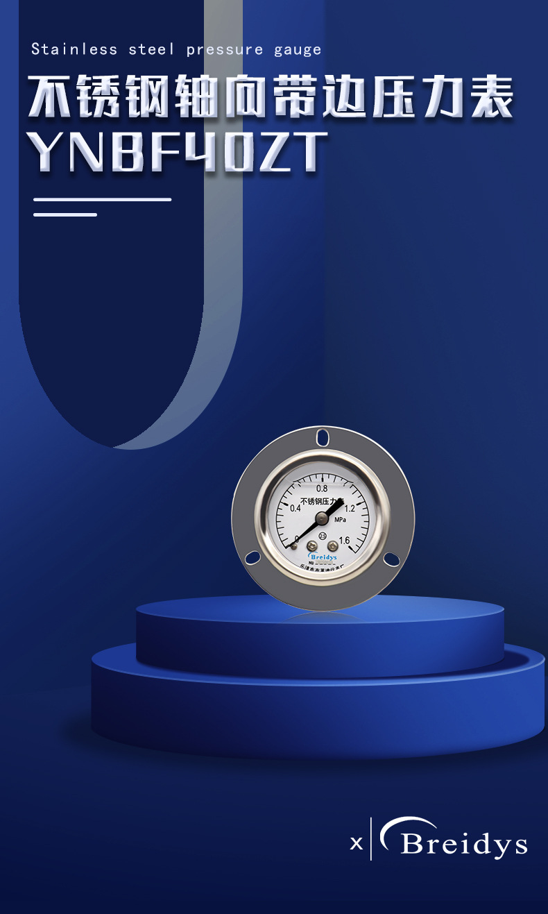 YNBF40ZT Stainless Steel Pressure Gauge (0-1.6MPa, 40mm Dial, Axial Connection) for Pneumatic Hydraulic Systems