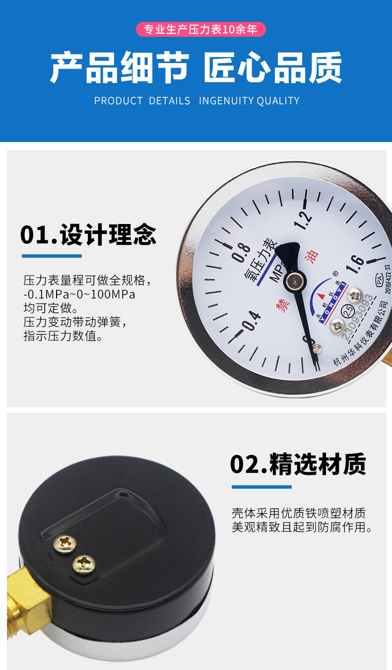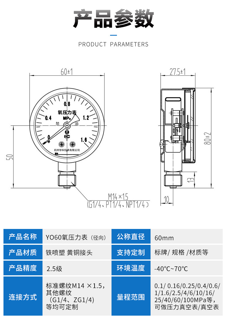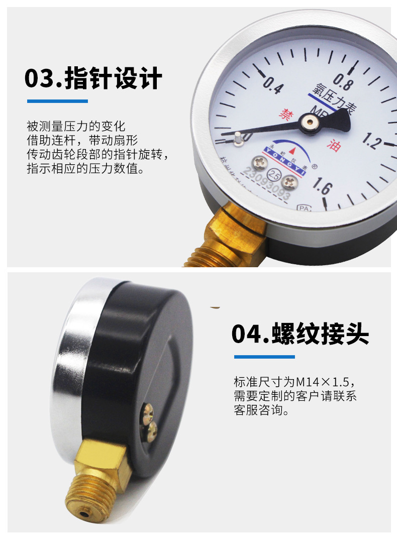 YONGYI YO60 Radial Oxygen Pressure Gauge (0-1.6MPa, 2.5 Accuracy) for Water, Hydraulic, Oil and Gas Systems