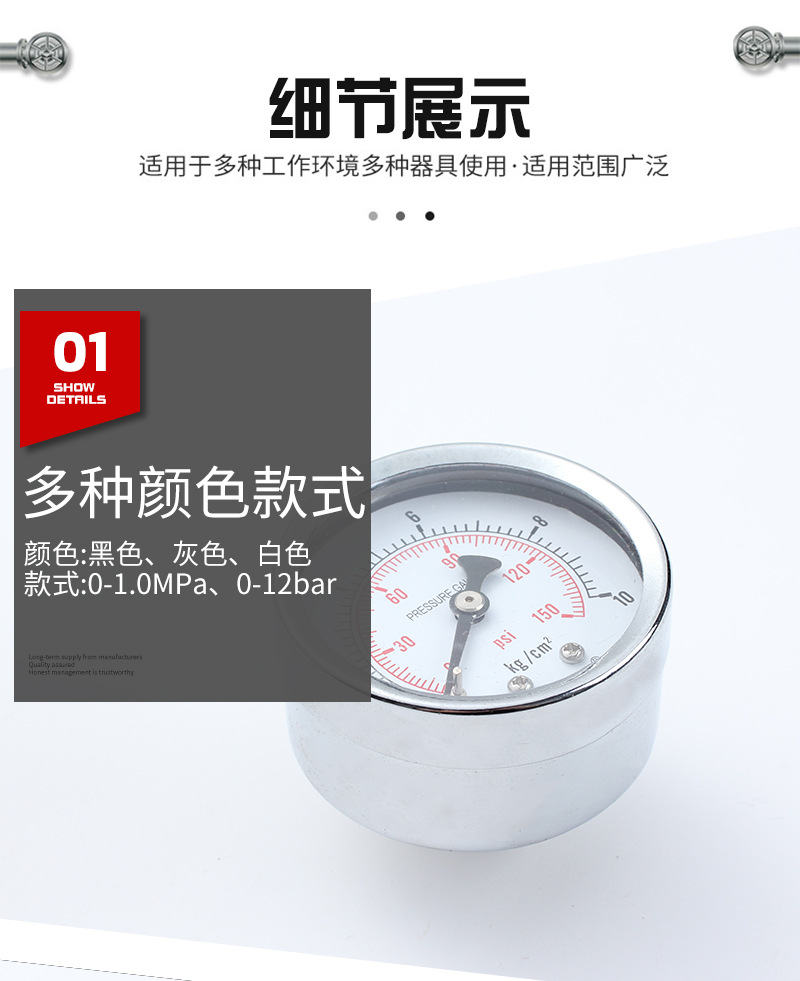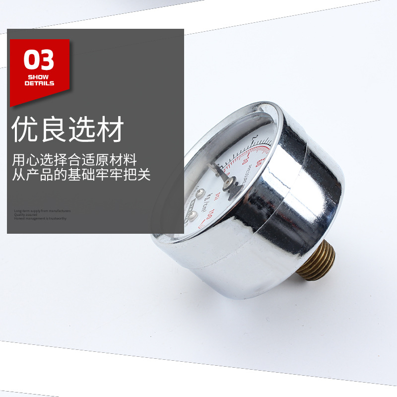 - Wide Compatibility: Y60 axial pressure gauge suitable for various industrial and domestic water pressure measurement applications, offering multiple specifications like 0-1MPa, 0-1.6MPa, 0-2.5MPa, and 0-0.6MPa to meet diverse needs.