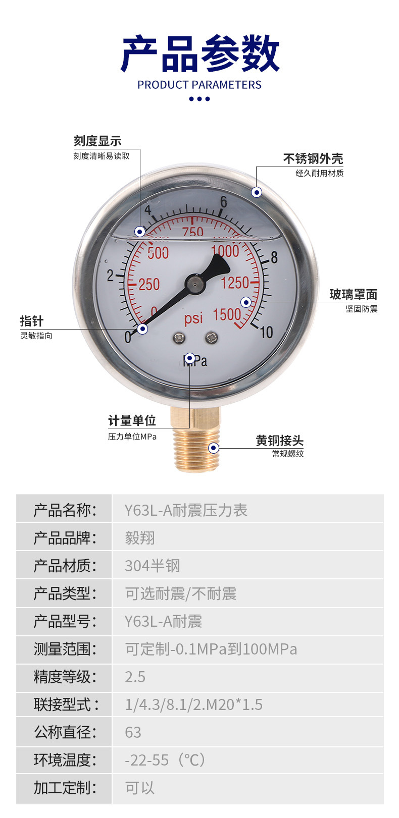 Yi Xiang Y63L-A Shock-Resistant Pressure Gauge (0-10MPa / 0-1500psi) for Water, Oil, Air Systems