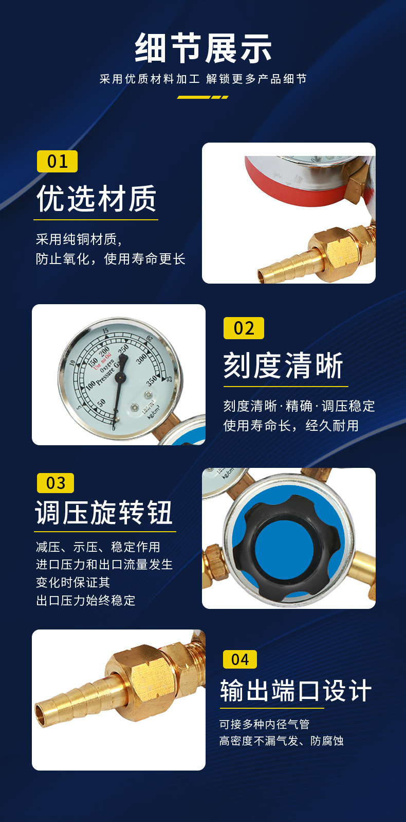 - Stable Output: Diaphragm-type structure maintains a steady low-pressure gas output from high-pressure sources, crucial for consistent operation in welding and cutting.