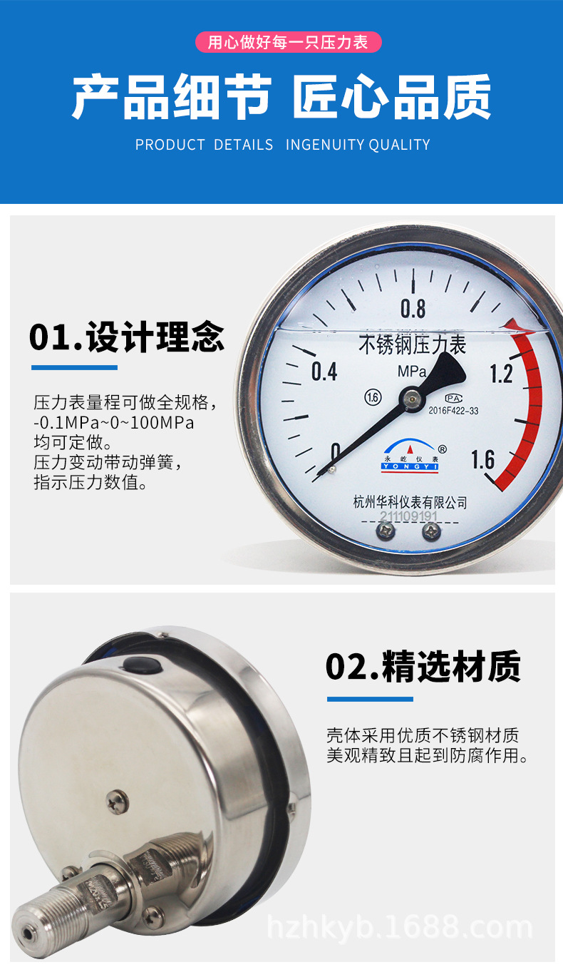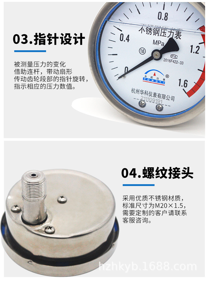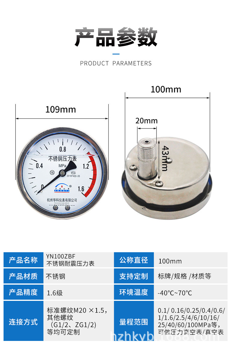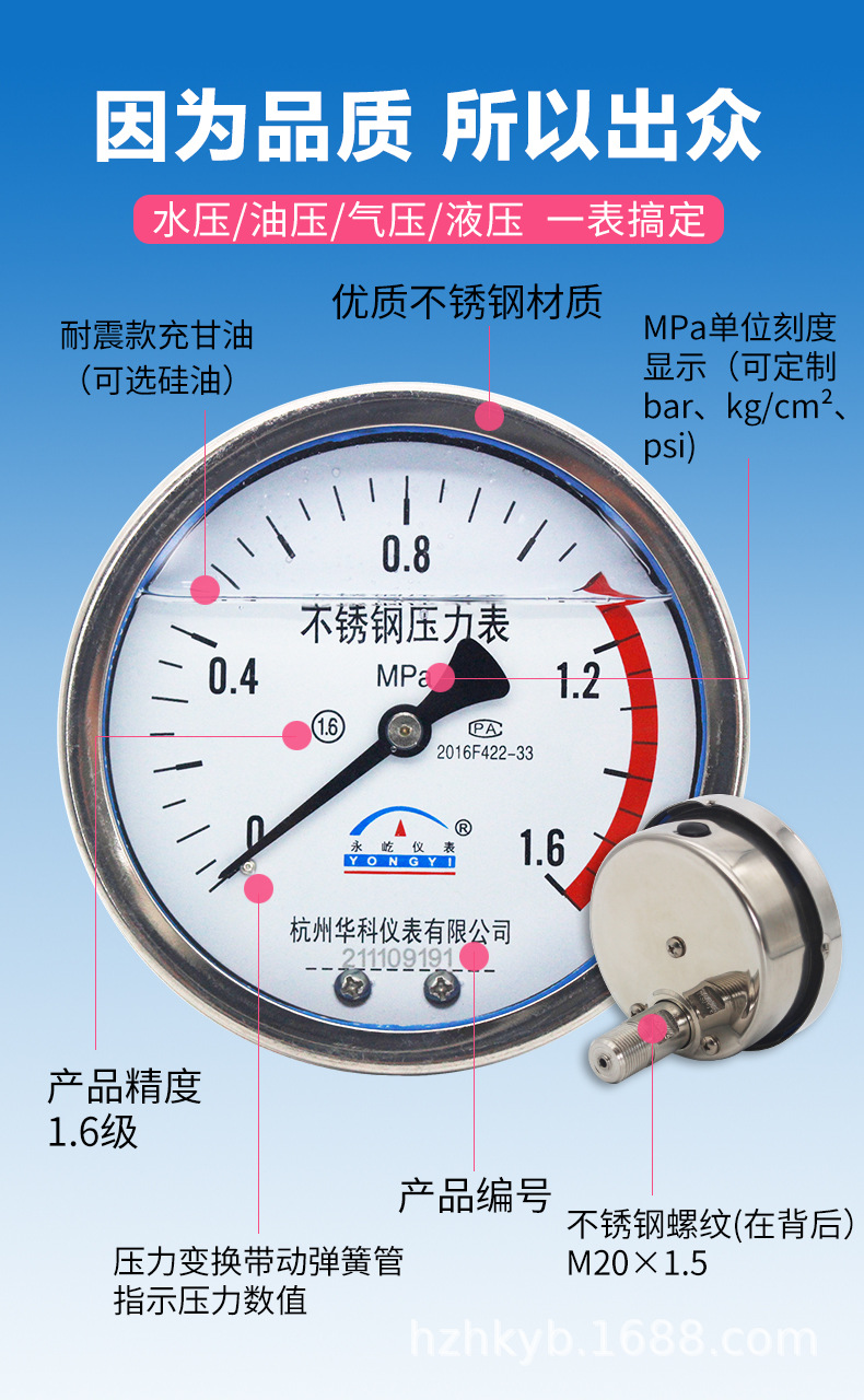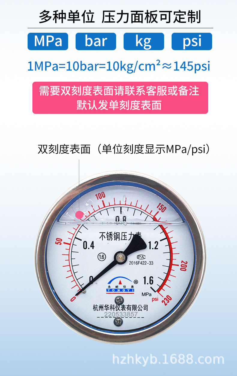 - Precision Measurement: Features an axial design with a measurement range of 0-1.6 MPa and a 1.6 accuracy class, providing reliable and precise pressure readings.