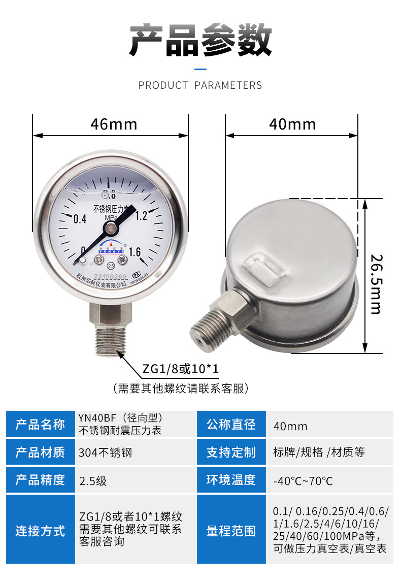 - What You Get: One Yongyi YN40BF stainless steel pressure gauge. Built for long-lasting accuracy and robust performance, backed by reliable manufacturing.
