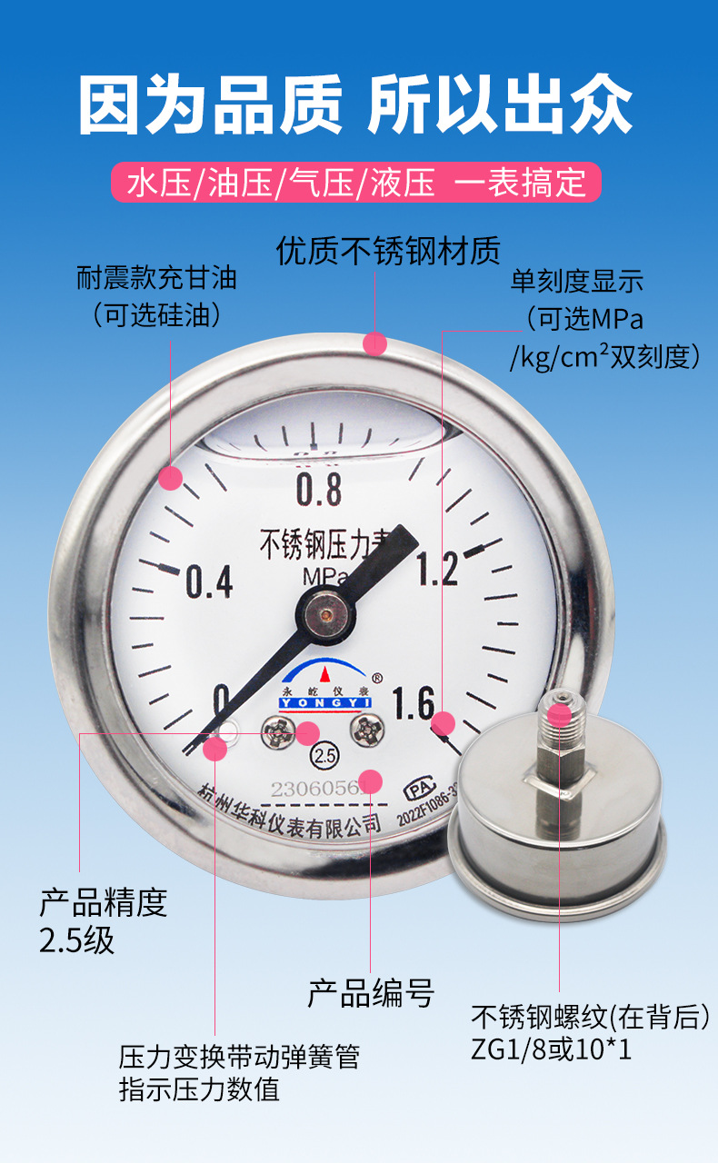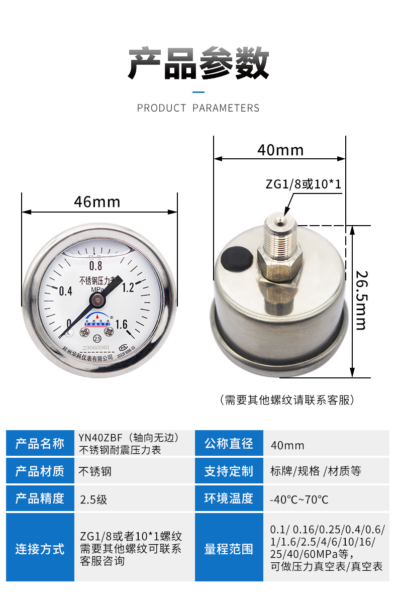 - What You Get: One Yongyi YN40ZBF Stainless Steel Pressure Gauge. Manufactured by Hangzhou Huake Instrument Co., Ltd., guaranteeing quality and factory-direct support.