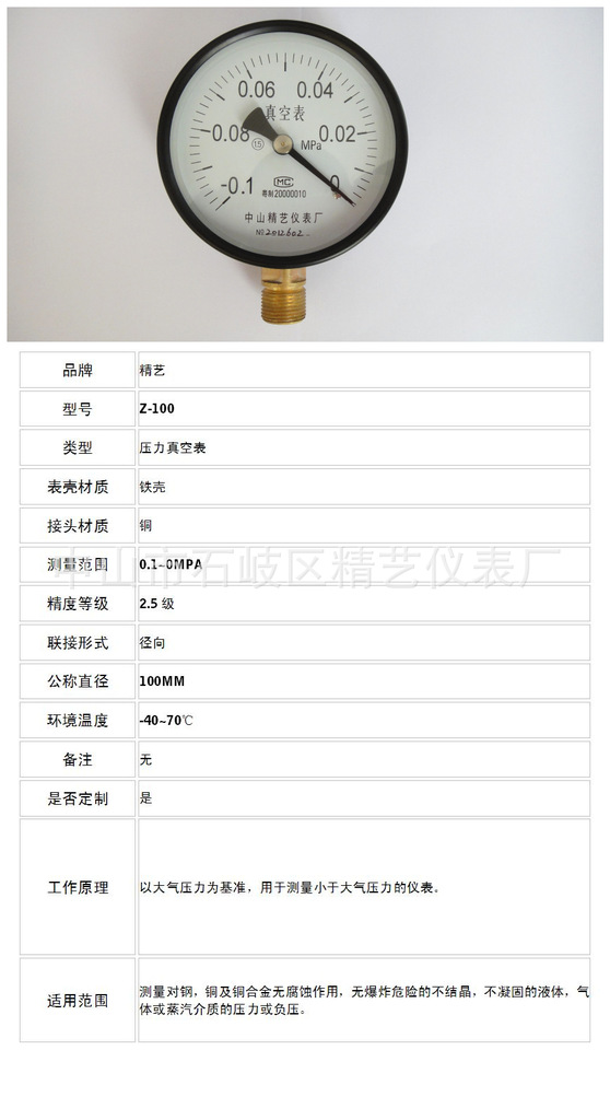Z-100 Vacuum Pressure Gauge (-0.1~0 MPa) with Iron Housing and Copper Connector for Industrial HVAC Systems