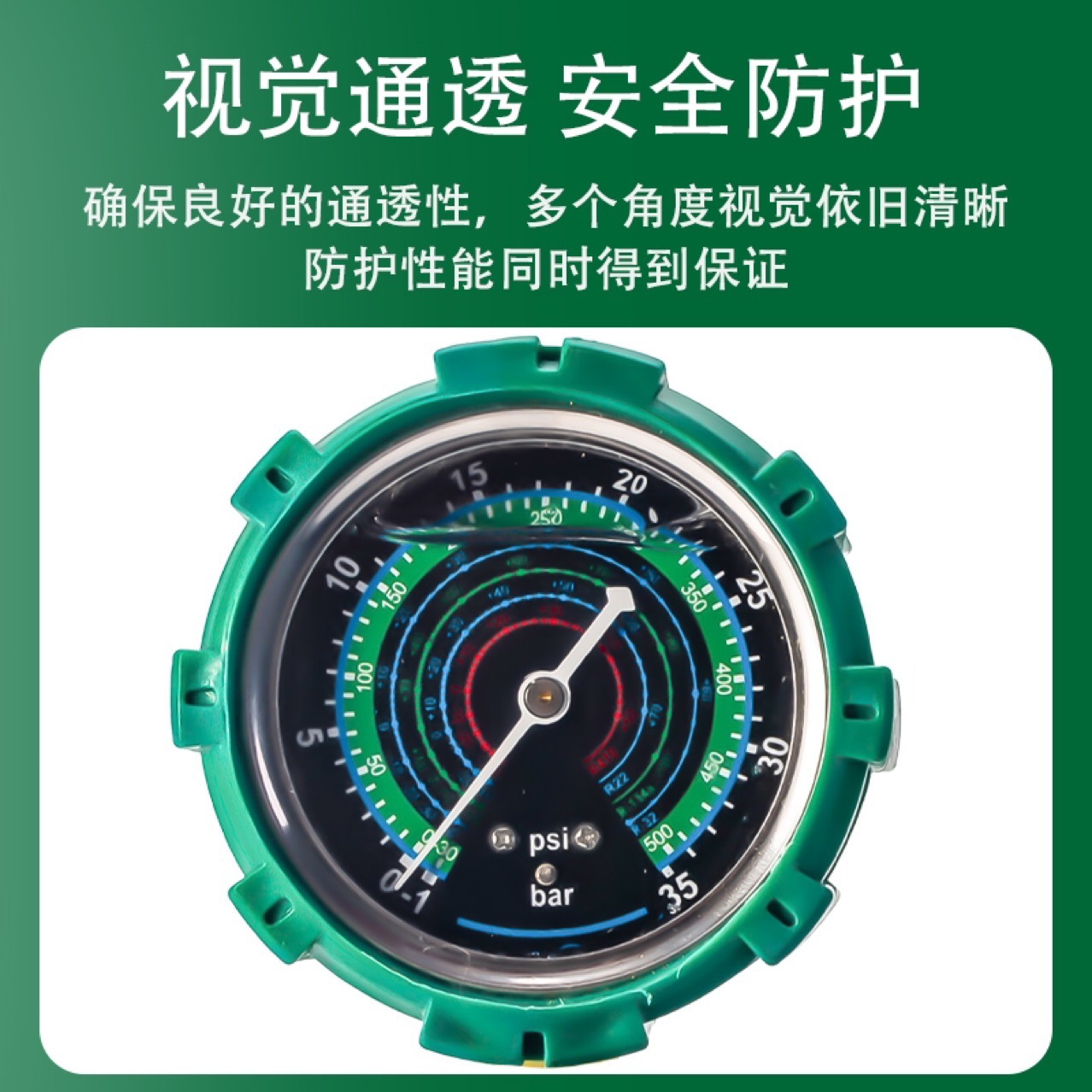- Основные характеристики и производительность: Equipped with clear dual pressure gauges (psi/bar) for precise refrigerant readings and a built-in sight glass to monitor refrigerant flow during charging or evacuation.