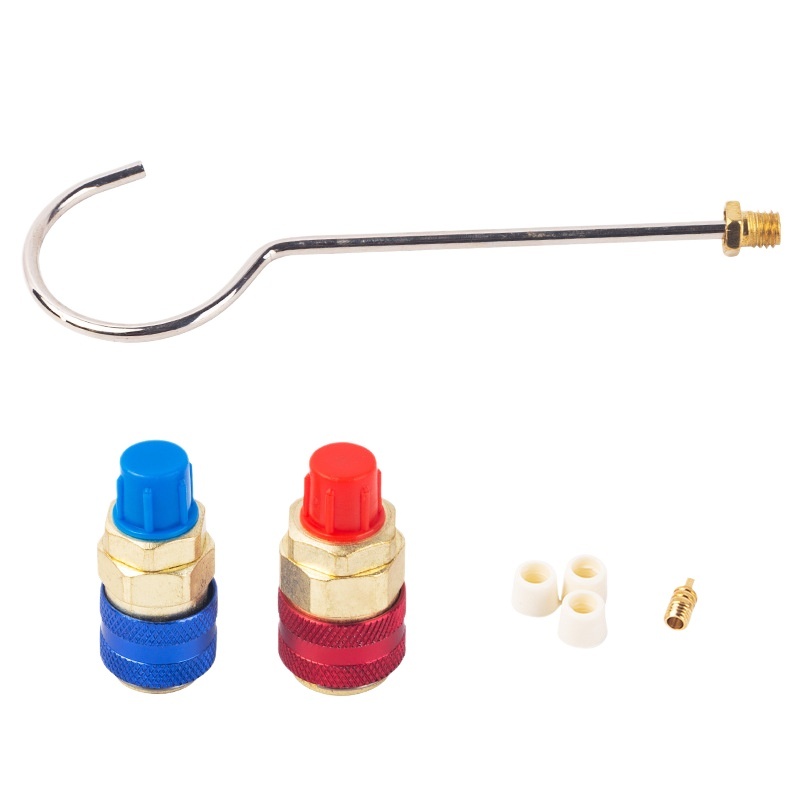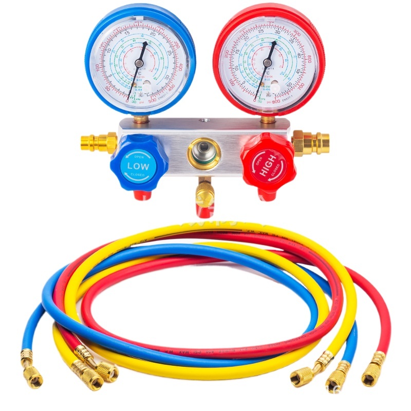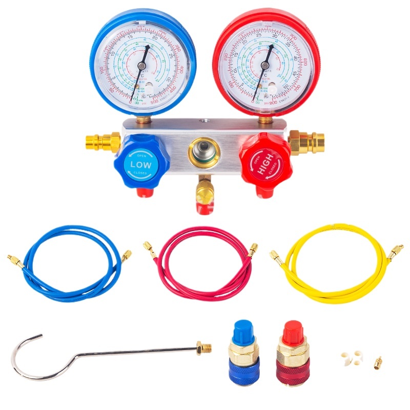 - Что вы получаете: Complete set includes a dual manifold gauge, three color-coded charging hoses (red, blue, yellow), two quick couplers, and a hanging hook, offering a comprehensive solution for AC service.