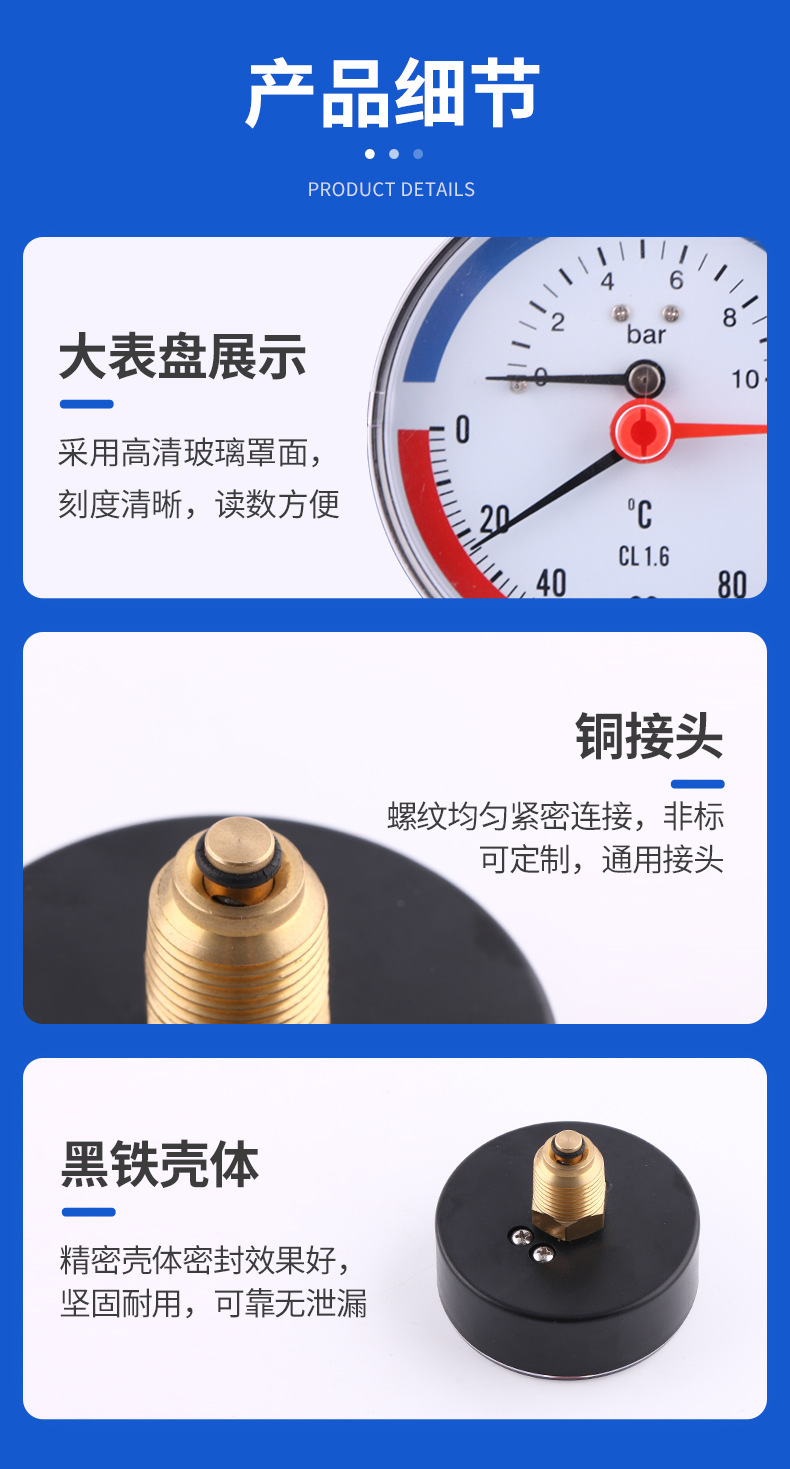 - ข้อมูลจำเพาะหลักและประสิทธิภาพ: Offers dual measurement ranges of 0-10 bar for pressure and 0-120°C for temperature, with a precision accuracy of ±1.6% (CL 1.6).