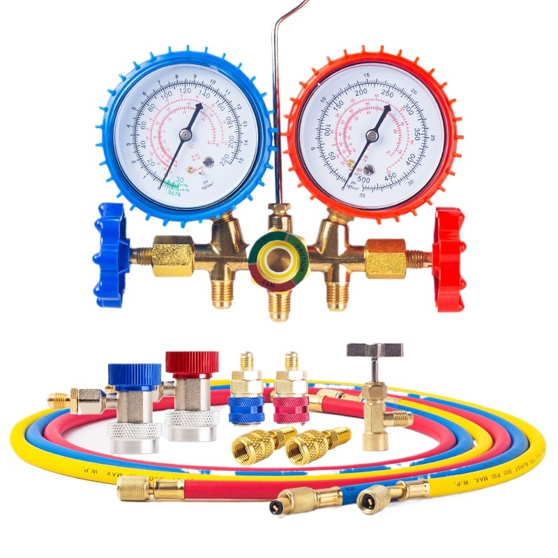 - ข้อมูลจำเพาะหลักและประสิทธิภาพ: High-pressure gauge up to 500 PSI, low-pressure gauge up to 250 PSI, with color-coded hoses for easy identification and secure connections.